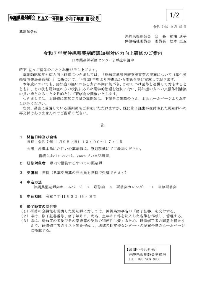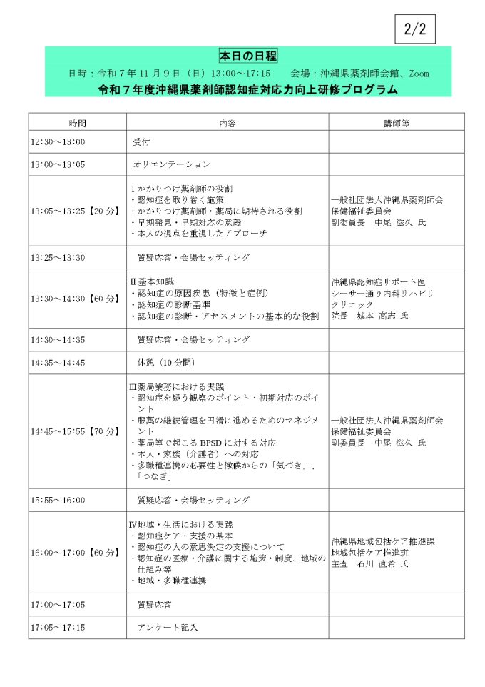 2025年10月15日 / 最終更新日 : 2025年10月15日 Web担当者 お知らせ 【研修会のご案内】令和7年度沖縄県薬剤師認知症対応力向上研修 令和7年度 沖縄県薬剤師認知症対応力向上研修のご案内 認知症の疑いのある方に早期に気づき、かかりつけ医等と連携して対応するとともに、その後も認知症の方の状況に応じた薬学的管理を適切に行い、認知症の方への支援体制構築の担い手となることを目的として研修会を開催いたします。 ■お申込みは、こちら➔令和7年度沖縄県薬剤師認知症対応力向上研修申込