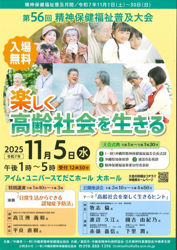 楽しく高齢社会を生きる」と題した第56回精神保健福祉普及大会を、下記のとおり開催いたします。
