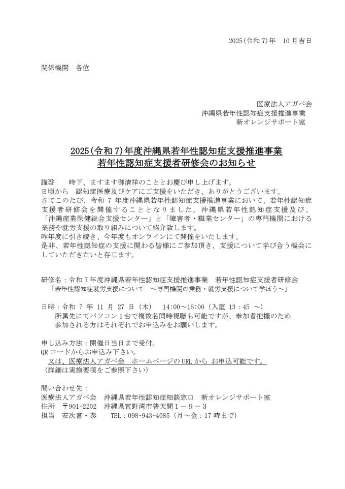 【研修会のご案内】2025年沖縄県若年性認知症支援推進事業/支援者研修会
